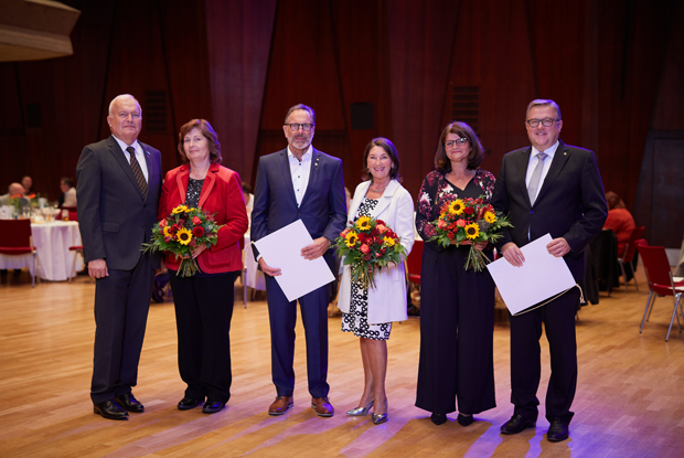 Besondere Verdienste würdigt der LIV mit Goldenen Ehrennadeln: Hans Wittmann, Dieter Schmid sowie Anton Schiller jeweils mit Ehefrau.