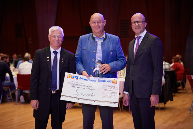 Klaus Fella, Vorstandsvorsitzender der Bürgerstiftung Erlangen (m.) freute sich über den von Verbandspräsident Peter Aicher und Hauptgeschäftsführer Kai Gajewski überreichten Scheck.